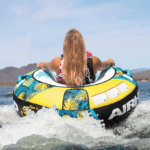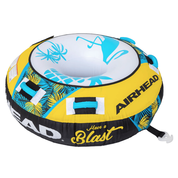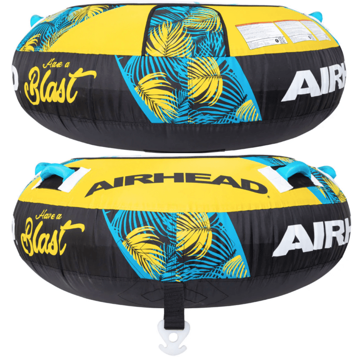 Few towable boat floats offer family fun like Blast 1 , our 1 person towable tube. The Airhead Blast towable tube boasts a yellow and teal tropical pattern, 4 neoprene comfort handles, and a self-draining floor that keeps riders upright no matter how much splashing happens.