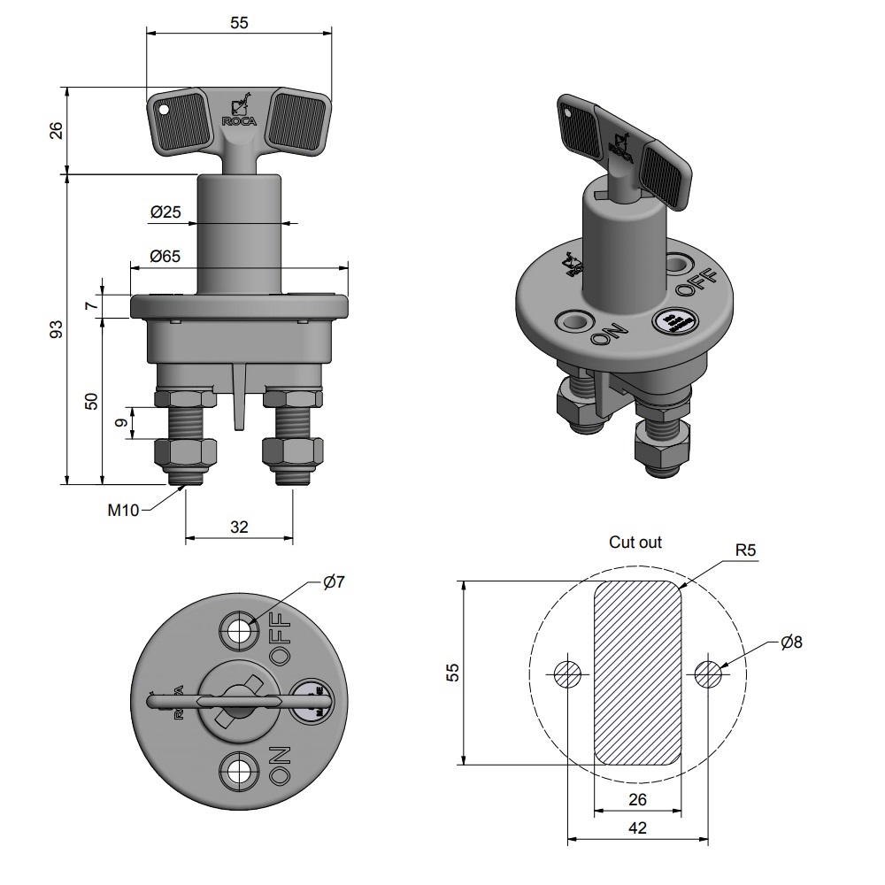A battery switch with flame-proof housing and a removable key for your boat. The battery switch fits accumulators up to 250 A/24 V.