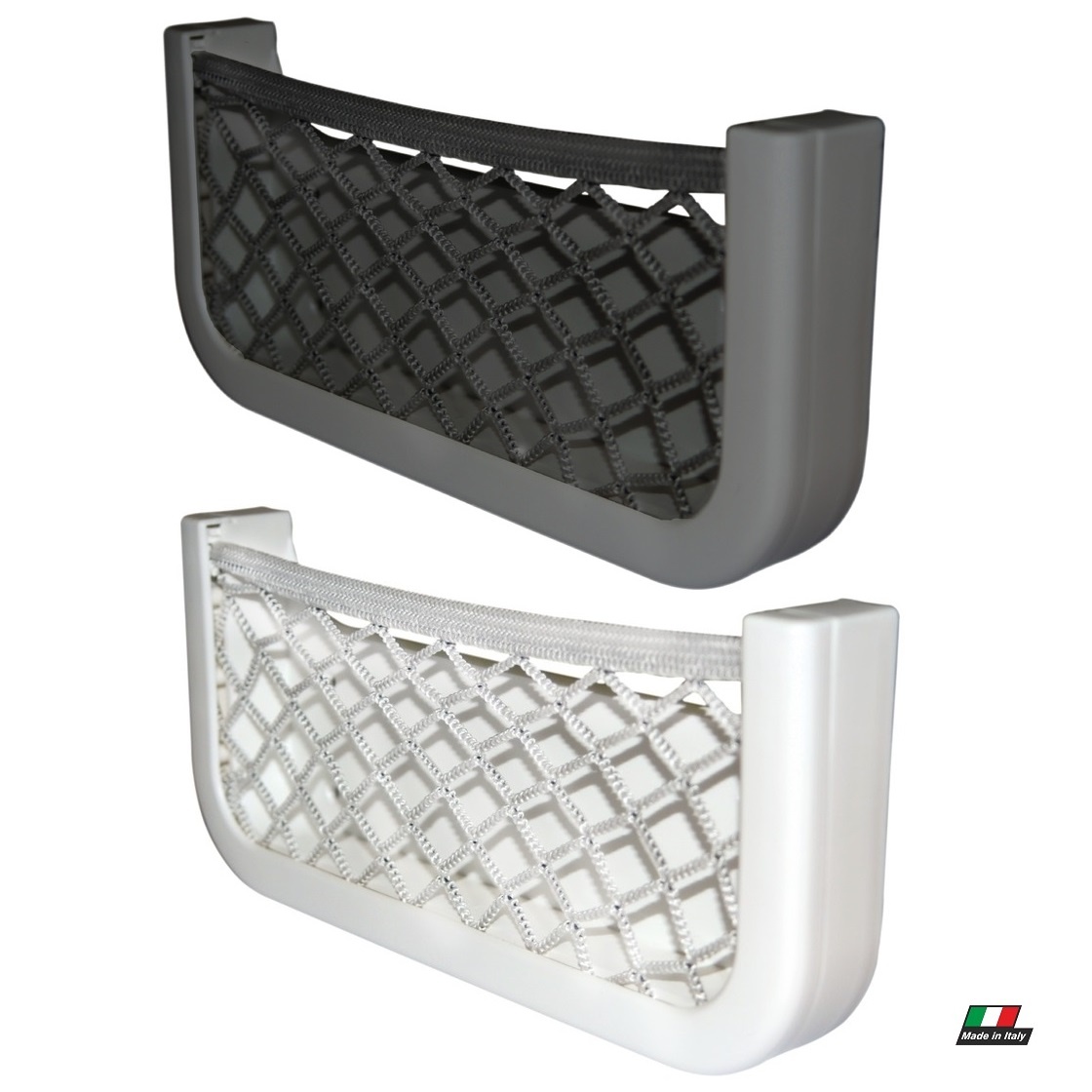 White ABS body with woven nylon elastic net. Self-adhesive back or to be fixed with 4 screws.