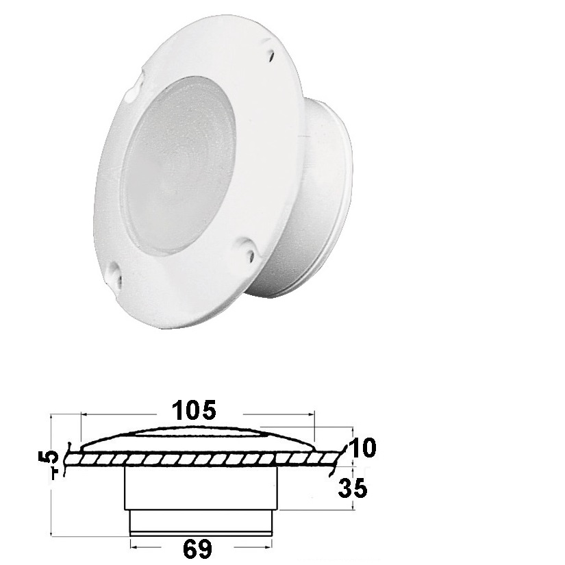 100% watertight, fitted with very sturdy plexiglass clear lens, designed for mounting on the cockpit bulkheads or on the flybridge. Also suitable as dock light for stern mounting and it may also be used as underwater light in tanks or pools. UV-resistant Luran body.• Flush mount