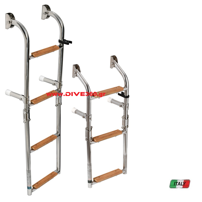 Σκάλα Inox Τηλεσκοπική κατασκευασμένη από γυαλισμένο ανοξείδωτο ατσάλι Aisi 316 με υψηλής ποιότητας φινίρισμα, ενώ τα σκαλοπάτια της έχουν επένδυση απο ξύλο Iroko .