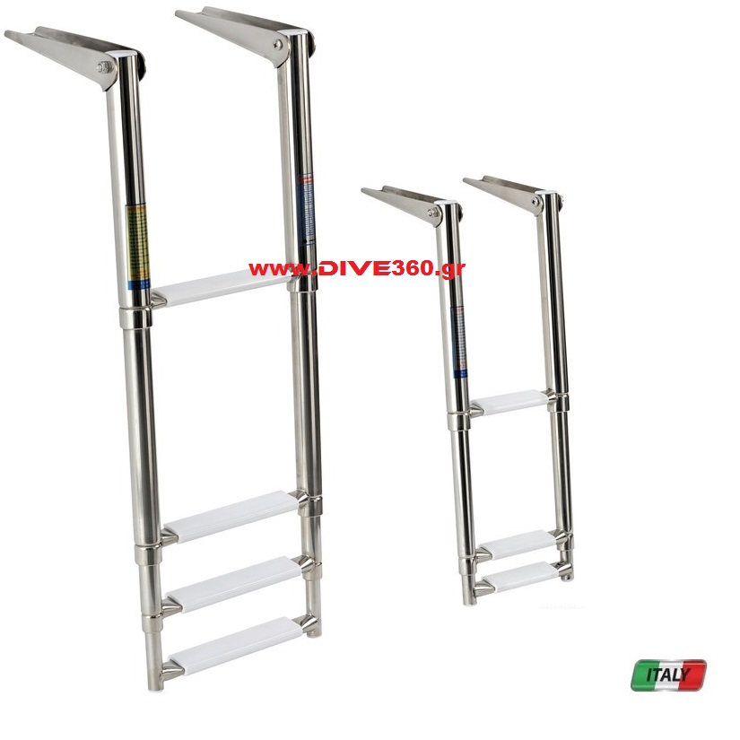 Σκάλα Inox Τηλεσκοπική κατασκευασμένη από γυαλισμένο ανοξείδωτο ατσάλι Aisi 316 με υψηλής ποιότητας φινίρισμα, ενώ τα σκαλοπάτια της είναι οβάλ επικαλυμμένα με λευκό αντιολισθητικό πλαστικό.