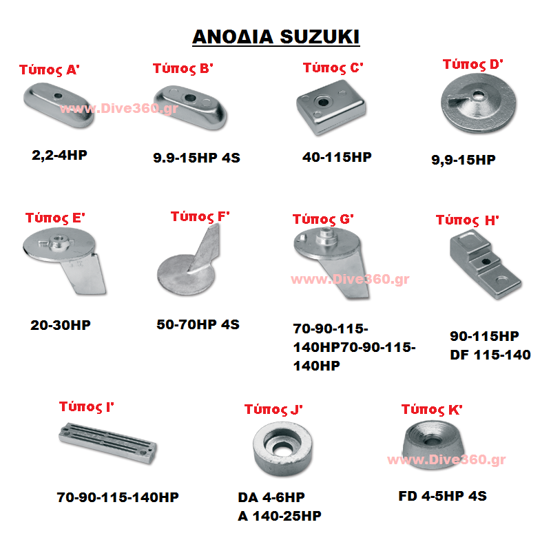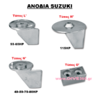 Ανόδια για εξωλέμβιες Suzuki απο 2,5 εώς 225ΗΡ. Βρείτε στην φωτό το ανόδιο της μηχανής σας και επιλέξτε τον τύπο. Αν δεν βρίσκετε το ανόδιο σας τότε γράψτε μας στις παρατηρήσεις πιο ψάχνετε καθώς και το μοντέλο του κινητήρα σας (χρονολογία), τους ίππους και αν είναι δίχρονο ή τετράχρονο.
