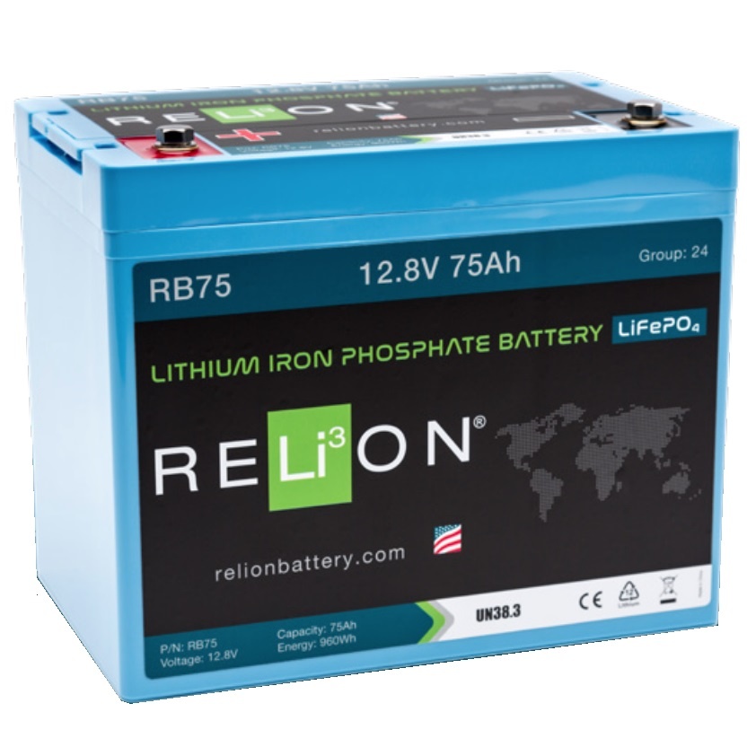 This 12V 75Ah lithium iron phosphate battery is often used in larger applications, including marine, RVs and electronic vehicles. It maintains consistent power and is equipped with an M8 terminal type and a built-in battery management system (BMS). All RELiON LiFePO4 batteries have installation flexibility, fast-charging capabilities and are maintenance free.