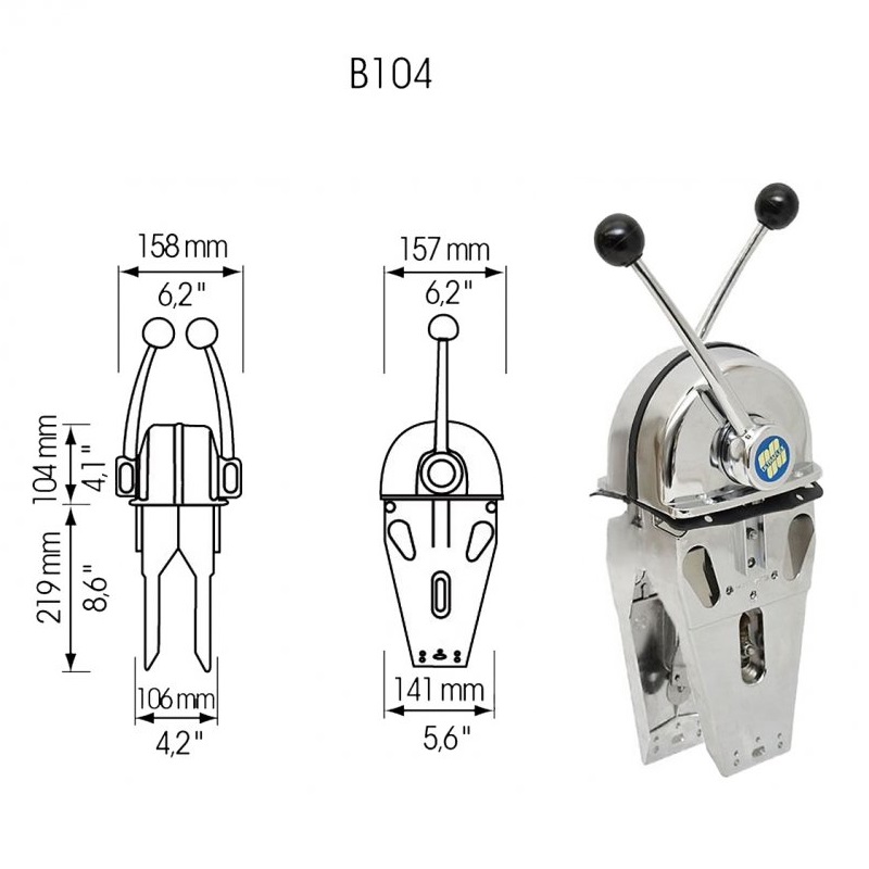 • Διπλό (Β104) – Κατάλληλο για δύο μηχανές, η κάθε λαβή διαθέτει διπλή λειτουργία για γκάζι και ρεβέρσα. Δεξιά ή αριστερά τοποθέτηση. Κατάλληλο για όλους τους τύπους μηχανών θαλάσσης. Διαθέτει ασφάλεια στην θέση “N” (neutral). Συνδέεται με ντίζα C8, C2. Περιέχει kit σύνδεσης.