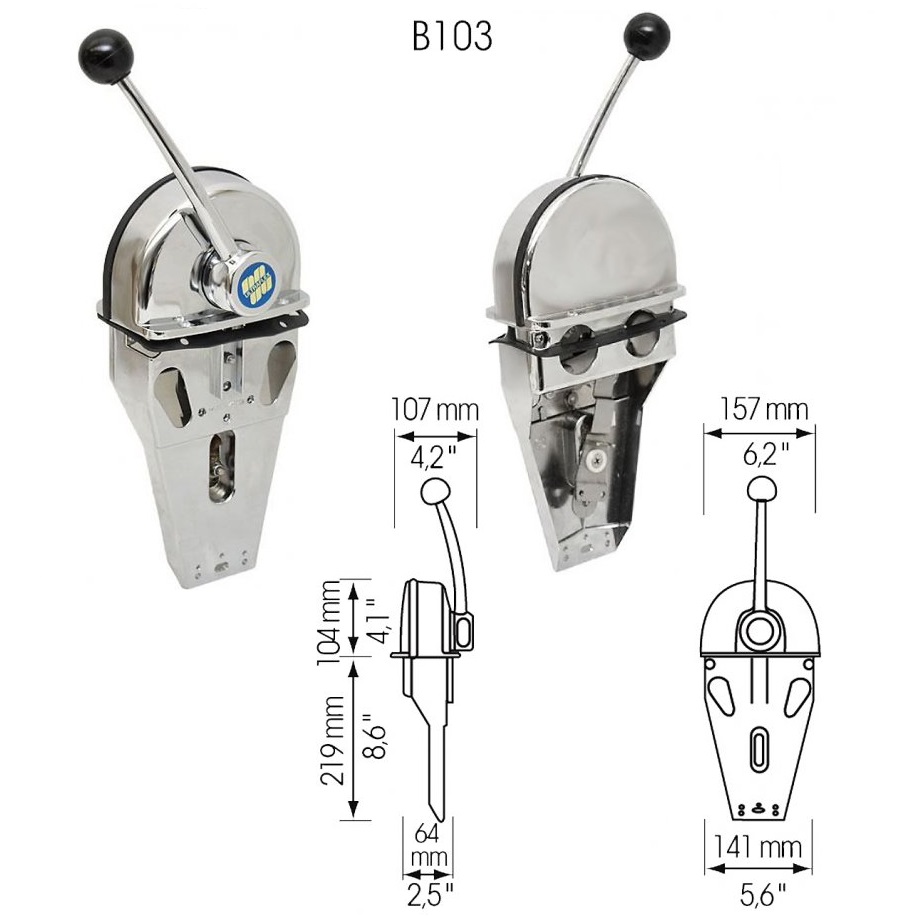 • Μονό (Β103) – Γκάζι και ρεβέρσα σε ένα λεβιέ. Διαθέτει ασφάλεια στην θέση “N” (neutral) και λειτουργία για ζέσταμα μηχανών. Για έναν κινητήρα.  Συνδέεται με ντίζες χειριστηρίου C2, C8. Περιέχει kit σύνδεσης.