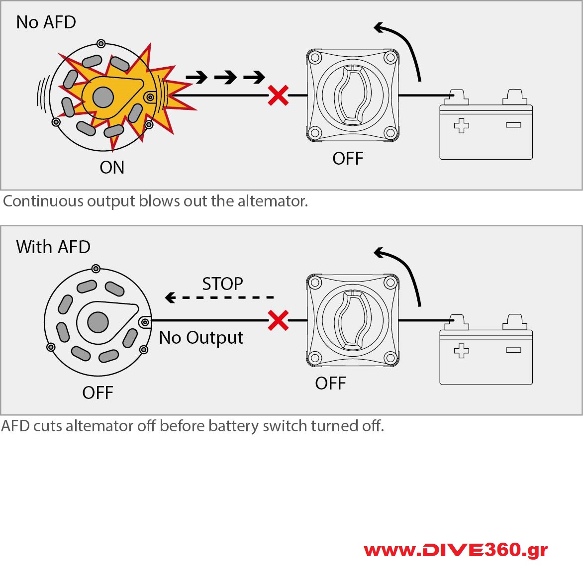 - Smallest battery switch with AFD (Alternator Field Disconnect) feature in market (BF441A, BF442A)